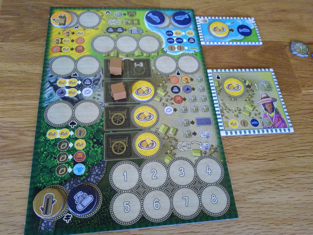 In meiner ersten Runde hatte ich deutlich unterschätzt wie wichtig der Straßenbau ist und habe bis zum Ende versucht diesen Fehler auszugleichen. Der Großteil der Punktedifferenz stammte jedoch trotzdem daher, dass mein Mitspieler zum Spielende noch einige Waren einlagern konnte. In meiner zweiten Partie hatte ich eigentlich versucht mich mehr auf die Straße zu konzentrieren, gleichzeitig wollte ich aber auch den Mais nicht komplett verschwenden und ja auch noch einige Ausbauten ergattern, was dazu führte, dass ich bei einer der wenigen Gelegenheiten gleich zwei Holz und zwei Stein zur Verfügung hatte und dann dummerweise erstmal in ein Haus und ein Boot investierte… ob das so klug war?